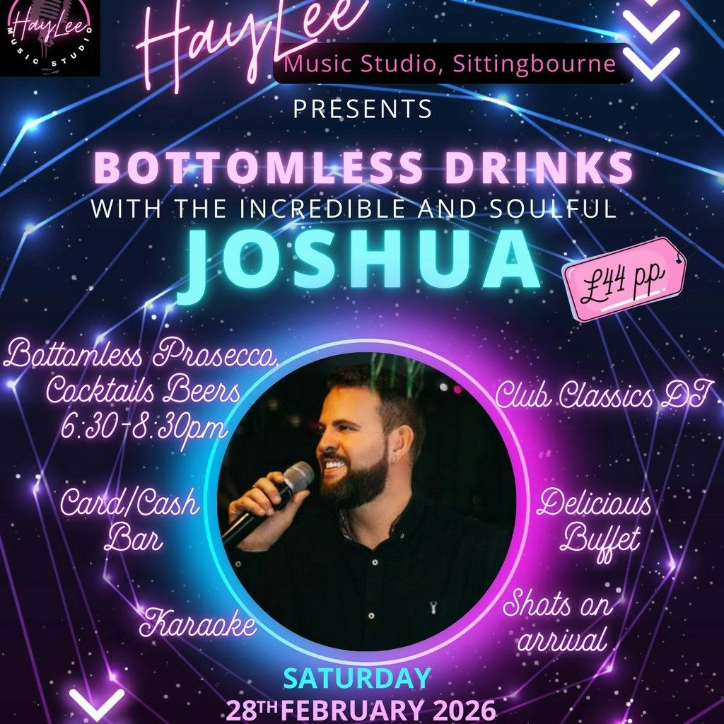 Step into an evening of glamour at HayLee Music Studio in Sittingbourne, where live music, bottomless drinks and a VIP atmosphere come together for an unforgettable night. From 7:30pm the outstanding vocalist Joshua takes the stage with polished vocals and crowd-pleasing favourites that promise to fill the room and lift the mood.
