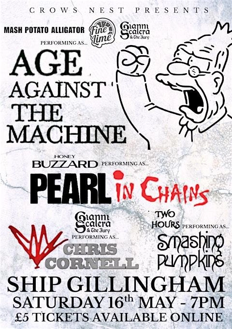 Join a high-energy tribute night at The Ship Inn on Court Lodge Road in Gillingham, celebrating some of rock music's most iconic sounds. The bill features AGE against the machine, Pearl in Chains, ChrisCornell RIP and Smashpumpkin, four dedicated tribute acts delivering faithful renditions and crowd-pleasing performances. Whether you are a fan of hard-hitting riffs, soaring vocals or nostalgic alternative anthems, this Ship tribute night promises a lively atmosphere and authentic live sound.