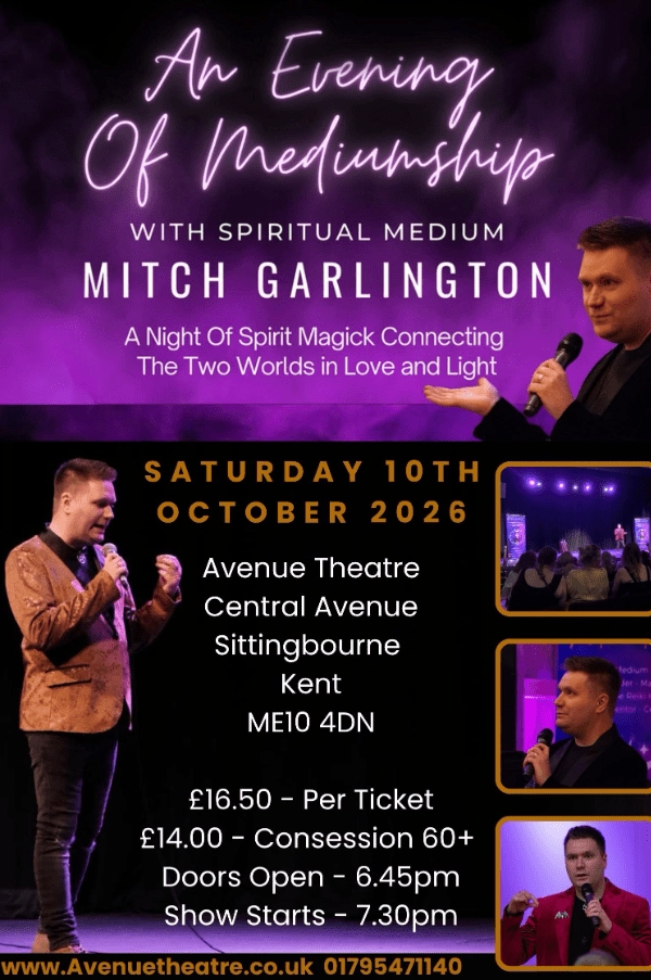 Practical details including the performance time and any age guidance can be found on the event organiser's booking page. The event is suitable for anyone curious about mediumship and the helping role public demonstrations can play in exploring spiritual communication. Reserve your place to experience An Evening of Mediumship with Mitch Garlington at The Avenue Theatre, Sittingbourne.