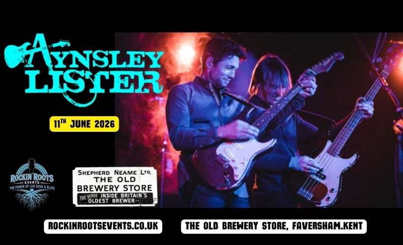 Rockin' Roots Events presents Aynsley Lister Band live at The Old Brewery Store in Faversham on Thursday 11th June 2026. Doors open at 19:00 for an evening of high-energy blues-rock in a unique venue with brewery heritage and excellent acoustics. This intimate setting promises a powerful concert experience for guitar lovers and blues fans alike.