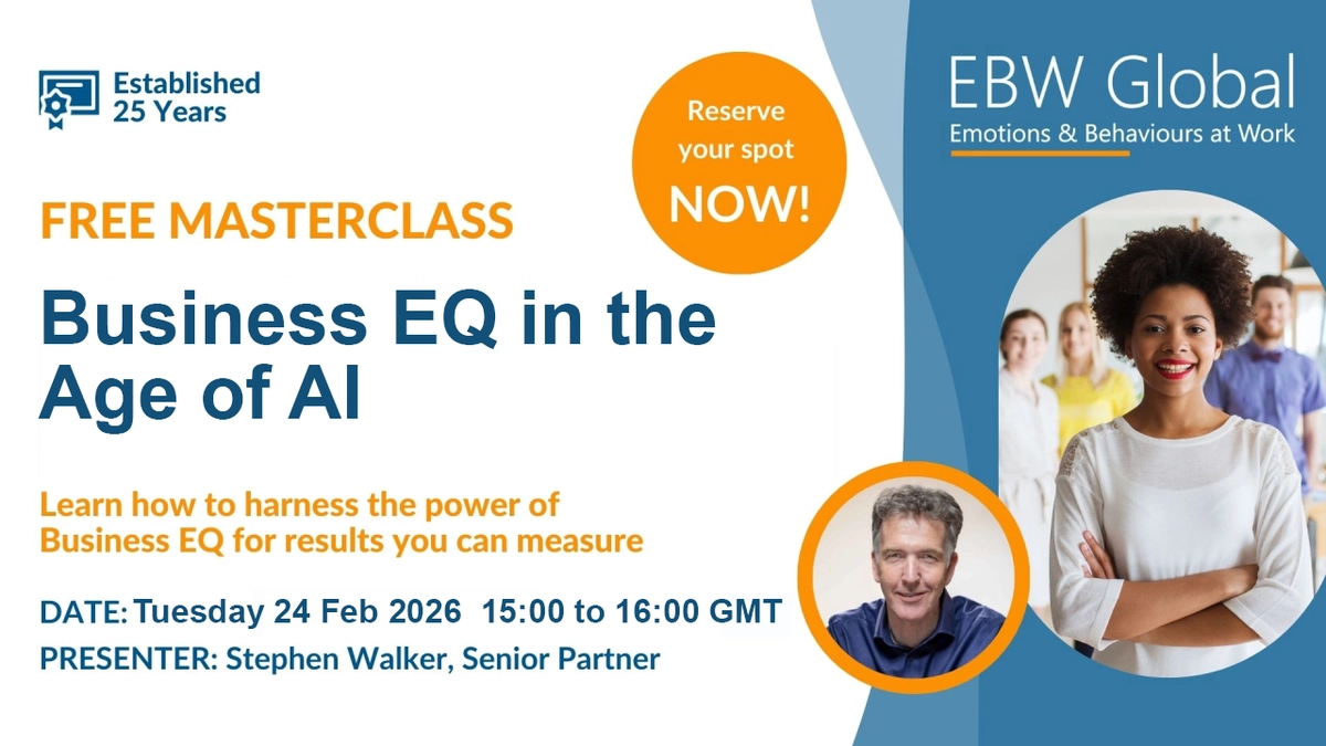 Business EQ in the Age of AI is a free 45-minute masterclass for HR, L&D and leadership professionals, coaches and workplace psychologists. Join Stephen Walker, Senior Partner at EBW Global, on Tuesday 24th February 2026 at 15.00 - 16.00 GMT in Chatham, England, to explore how emotional behaviour shapes decision-making and influence in AI-enabled workplaces and why many traditional development models no longer fit fast-moving contexts.