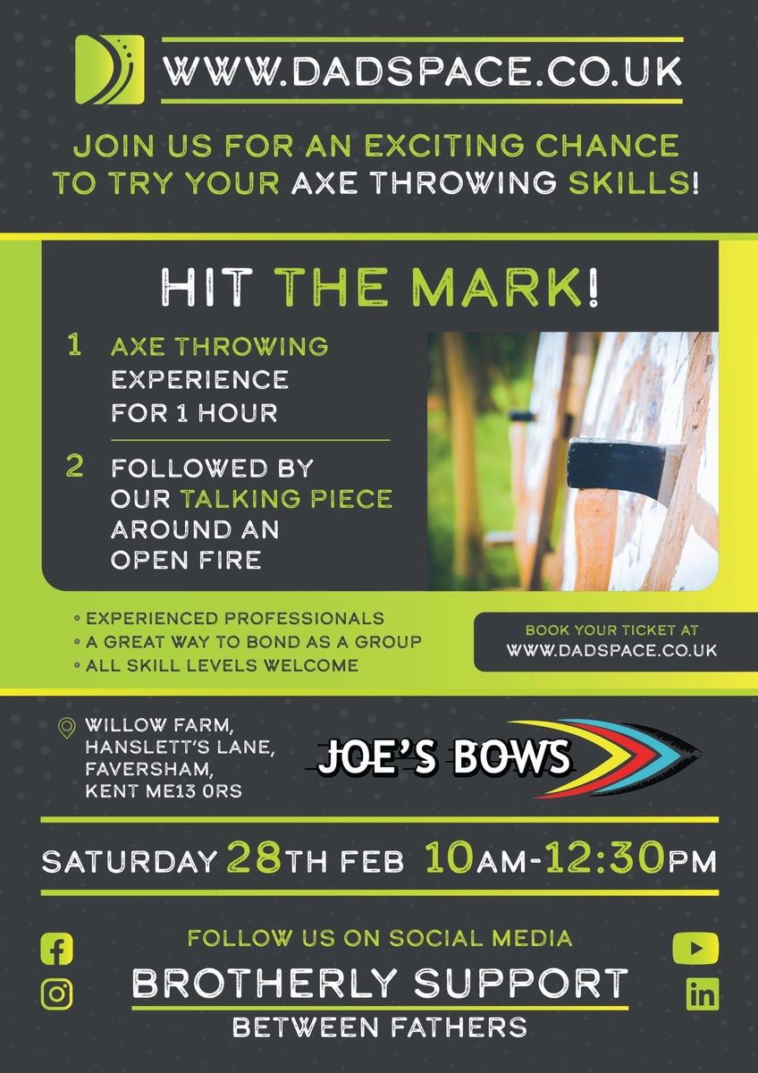 Join DadSpace for their first Axe Throwing Experience in Faversham at Willow Farm with Joe’s Bows. This relaxed, friendly morning is designed for dads who want to try something different, improve a new skill and meet others in a supportive setting. Axe throwing is a fun, hands-on activity that suits beginners and those who want to sharpen their technique under expert supervision.