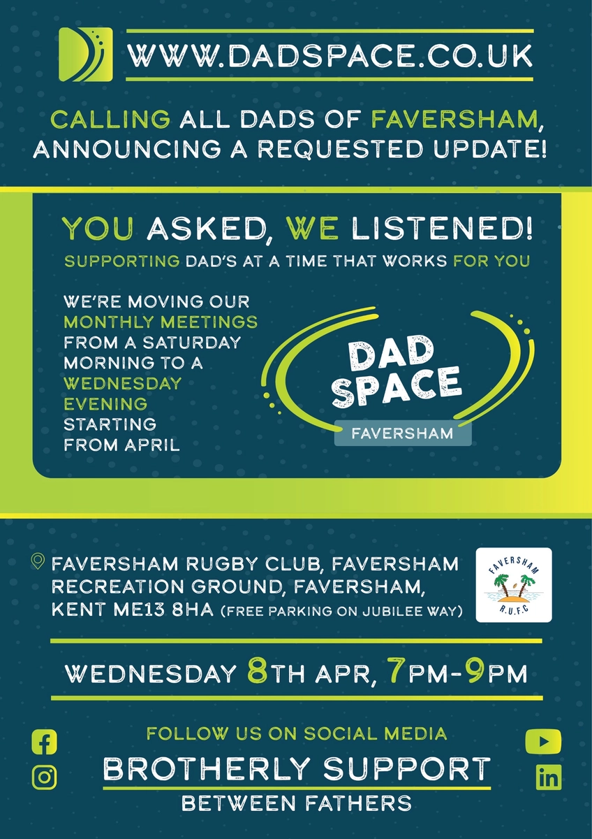Join fellow dads for the DADSPACE Faversham monthly meet-up on Wednesday 8th April, from 7:00 to 9:00 pm at Faversham Rugby Club. This friendly evening session has moved from a Saturday morning to a weekday evening so more fathers, stepfathers and male caregivers can make it along after work. It is a relaxed, informal chance to meet local dads, share experiences and build connections in a supportive setting in Faversham, Kent.