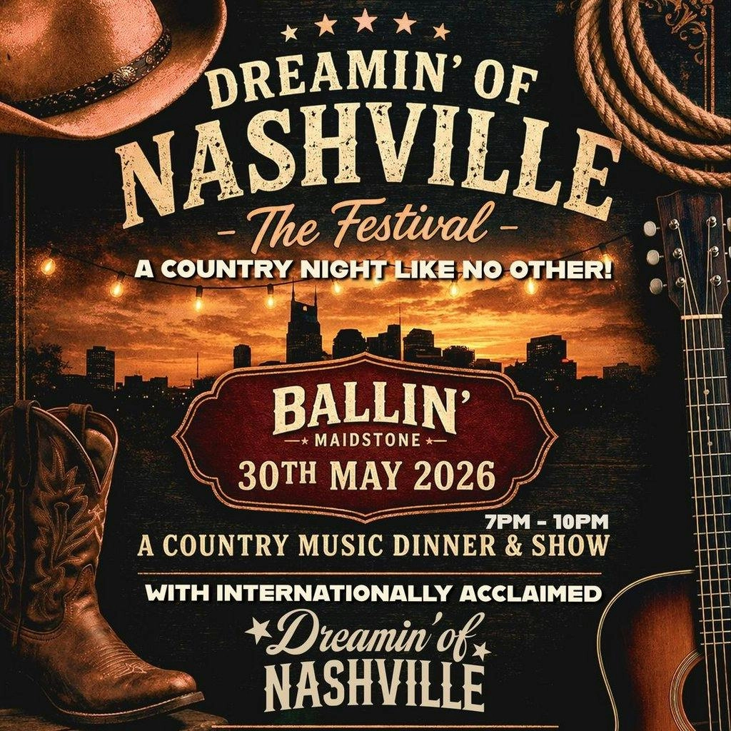 Experience a full-throttle country night at BALLIN' Maidstone with Dreamin' Of Nashville: The Festival. From the first beat to the final encore, this celebration brings authentic Nashville vibes to Maidstone with live music, high-energy dance and show-stopping performances. The internationally touring Dreamin' Of Nashville Country Show heads the bill, accompanied by the Honky Tonk Angels, the Disco Cowgirl and a jaw-dropping Country Violinist, creating a non-stop spectacle for fans of country, Americana and classic roots music.