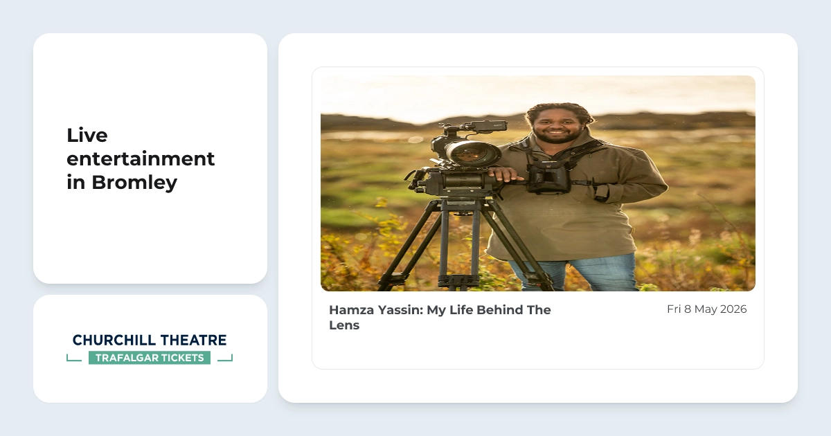 Join wildlife cameraman and presenter Hamza Yassin at Churchill Theatre Bromley for My Life Behind the Lens, his first nationwide theatre tour. Drawing on a career filming the natural world, Hamza shares his infectious sense of wonder and the most precious memories from life and nature. This live show blends storytelling, personal recollections and breathtaking footage to create an intimate portrait of a life spent chasing wild moments around the globe.