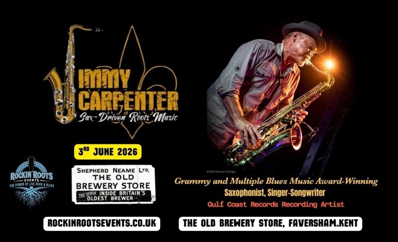 Experience an evening of authentic blues with Grammy winner Jimmy Carpenter at The Old Brewery Store in Faversham on Wednesday 3 June 2026. Doors open at 19:00. This is a rare chance to see one of the most in-demand horn players and band leaders performing material from his acclaimed catalogue and his latest album Just Got Started.