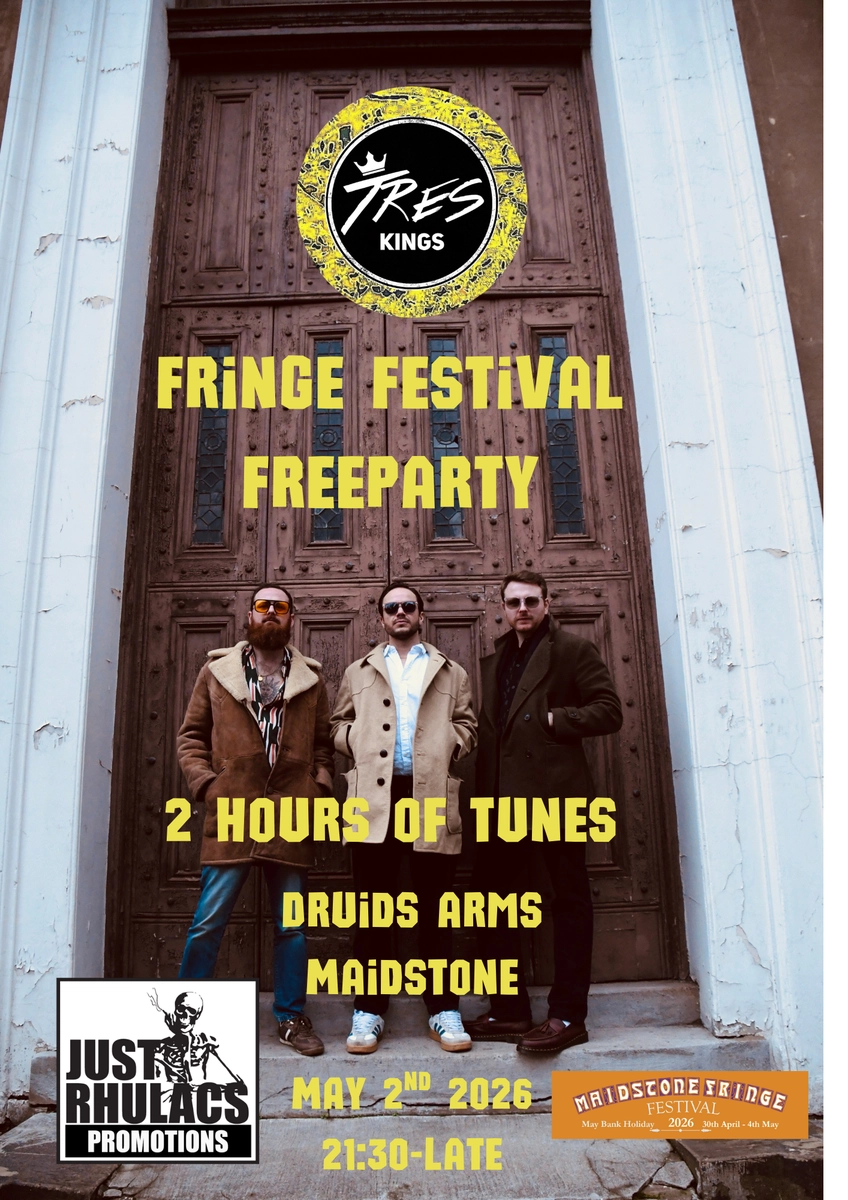Join Tres Kings and Just Rhulacs for a free Fringe Festival party at the Druids Arms in Maidstone on Saturday 2 May at 9:30pm. To celebrate the Maidstone Fringe Festival, Tres Kings will be playing a full two hour set, delivering songs from their brilliant catalogue alongside a handful of familiar covers guaranteed to get the room singing. The Druids Arms offers a lively pub setting ideal for live music nights, with a friendly atmosphere and plenty of energy as the band mark the festival with this special long set.
