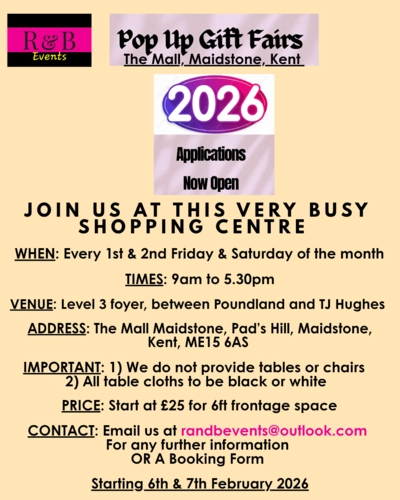 Discover thoughtful presents and seasonal finds at the Mother's Day Pop Up Gift Fair at The Mall Maidstone in Kent on 6 to 7 March 2026. Arranged by R&B Events and listed on Stallandcraftcollective.co.uk, this pop up gift fair is the ideal place to browse a wide selection of stalls offering gifts suitable for Mother's Day. Whether you are searching for a special treat, a unique card, or an unusual present you will find plenty of options in one convenient location in Maidstone.