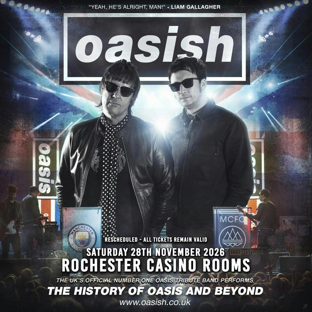 Experience the definitive Oasis tribute when Oasish brings their 2026 Tour to Casino Rooms, Rochester on Saturday 28 November 2026. Promoted as the UK's official No1 Oasis tribute, Oasish deliver a faithful celebration of Britpop and 1990s anthems, recreating the raw energy and iconic melodies that defined a generation.