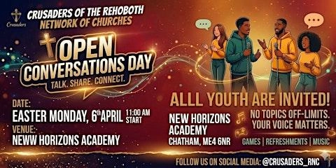 Open Conversations Day - Crusaders is an in-person gathering for young people to share, connect and be heard. Hosted at New Horizons Children's Academy, this event creates a safe, energetic and judgement-free space where Crusaders youth can come together to talk about the things that matter most. Whether you want to speak up, listen, or simply meet new friends, this is a relaxed environment built around real voices and real stories.