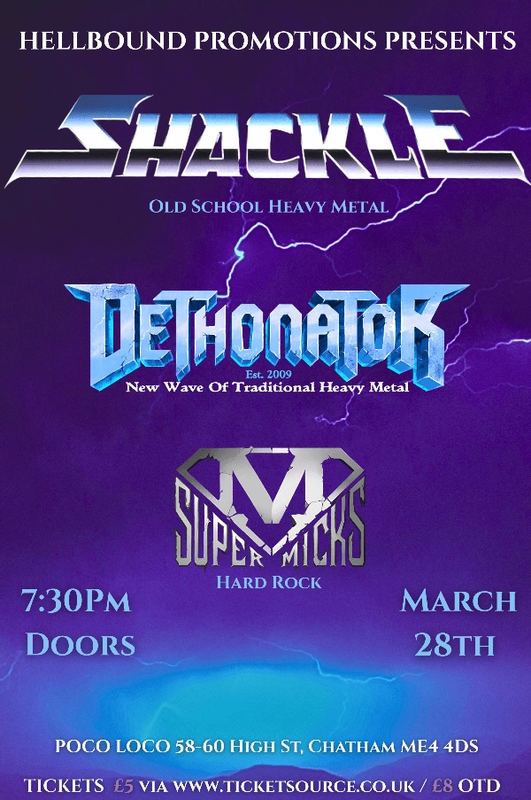 Tickets are now available for SHACKLE + DETHONATOR + SUPER MICKS at Poco Loco in Chatham on 28 March 2026. This lively gig brings together three acts for an evening of punchy, guitar-led live music in an intimate local venue. Whether you follow the underground scene or enjoy discovering new bands, this line-up promises energetic performances and a crowd-ready atmosphere at one of Chatham's popular live music spots.