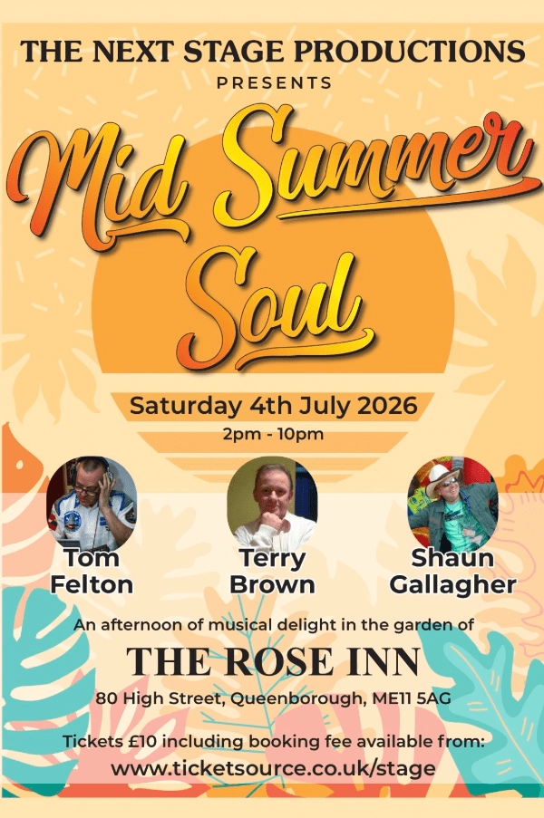 The Next Stage Productions presents "Midsummer Soul" at The Rose Inn in Queenborough, Sheerness. Tickets are now available through TicketSource for this intimate live show, bringing a relaxed and soulful evening to a popular local venue.