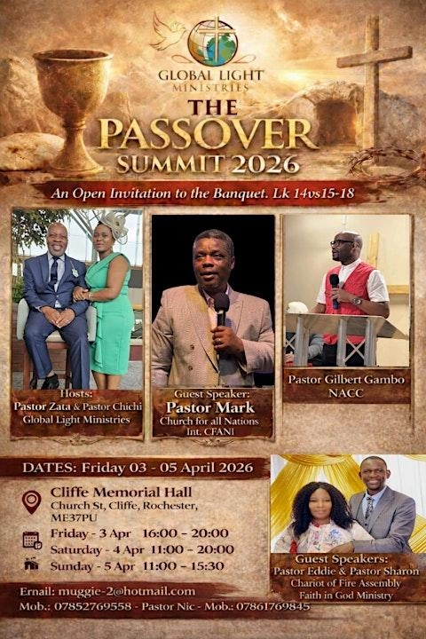 Join Global Light Ministries for The Passover Summit 2026, a three-day Easter gathering of worship, teaching and prayer at Cliffe Memorial Hall in Rochester, Kent. This conference offers a focused time to reflect on the sacrifice and resurrection of Jesus Christ and to celebrate the fulfilment of the Passover in Christ.